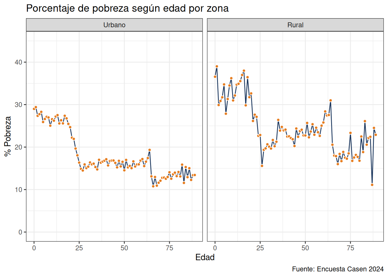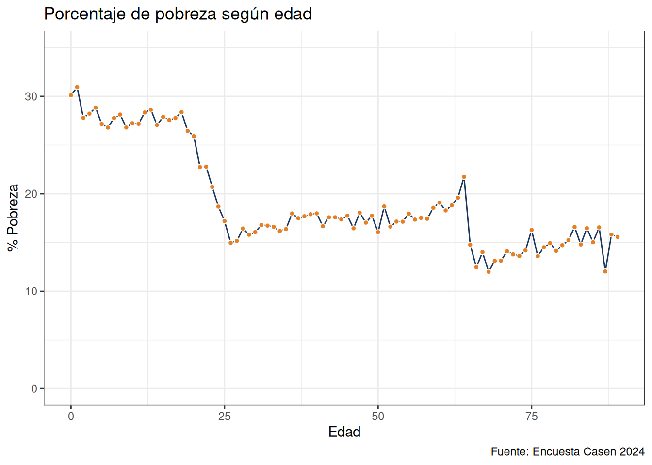 Luego a partir de esta base de datos contruimos el gráfico, ocupando dos geom, geom_point() y geom_line(), para dibujar una línea y puntos en cada edad, para visualizar la tendencia de la pobreza con la edad.